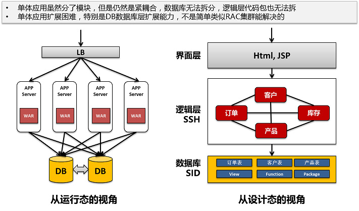 不管是從運(yùn)行態(tài)還是設(shè)計(jì)態(tài)來(lái)看,傳統(tǒng)的單體應(yīng)用最大的問(wèn)題就是各個(gè)組件和模塊之間緊耦合,而這種耦合帶來(lái)的問(wèn)題就是擴(kuò)展困難,升級(jí)和變更困難(模塊間相互影響大)。