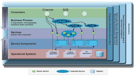 ■ 消費(fèi)者層:消費(fèi)者層是消費(fèi)者的入口,不管是人、程序、瀏覽器或者自動(dòng)操作,以及與 SOA 相互作用都可從此切入。這使得一個(gè) SOA 解決方案可以支持一個(gè)客戶端獨(dú)立的、通道不可知的功能集,通過一個(gè)或多個(gè)通道(客戶端平臺(tái)或設(shè)備)獨(dú)立消費(fèi)以及開出賬單。所以說它是所有內(nèi)外部交互式消費(fèi)者(人類或者其他應(yīng)用程序/系統(tǒng))和服務(wù)(例如,B2B 場景)之間的切入點(diǎn)。該層提供快速創(chuàng)建前端業(yè)務(wù)流程和綜合應(yīng)用程序的功能,以響應(yīng)市場變化。它使得通道能夠獨(dú)立訪問那些應(yīng)用程序和平臺(tái)所支持的各種業(yè)務(wù)流程。消費(fèi)者和其余底層 SOA 的解耦為組織提供支持敏捷性、增強(qiáng)重用以及提高質(zhì)量和一致性的能力。