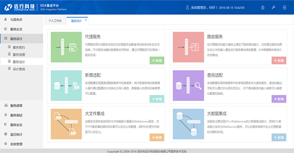 遠(yuǎn)行ESB服務(wù)總線包括服務(wù)訂閱,服務(wù)設(shè)計,服務(wù)部署,服務(wù)測試,監(jiān)控統(tǒng)計,服務(wù)安全多個功能模塊和子系統(tǒng),覆蓋服務(wù)實施全生命周期管理流程。