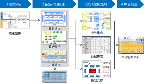 以SOA和企業(yè)架構(gòu)規(guī)劃思想為核心指導,企業(yè)業(yè)務(wù)驅(qū)動IT的思路,進行企業(yè)業(yè)務(wù)流程,數(shù)據(jù)架構(gòu)的梳理,拆分中臺給微服務(wù)模塊形成能力提供中心,并定義和識別開發(fā)API接口服務(wù)能力。