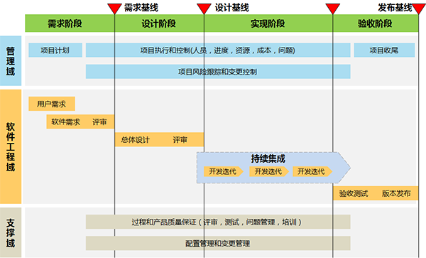 參考主流的CMMI過程模型和Scrum敏捷方法論,為企業(yè)構(gòu)建一套研發(fā)過程質(zhì)量管控標準規(guī)范體系, 實現(xiàn)軟件產(chǎn)品的持續(xù)集成和敏捷交付能力。